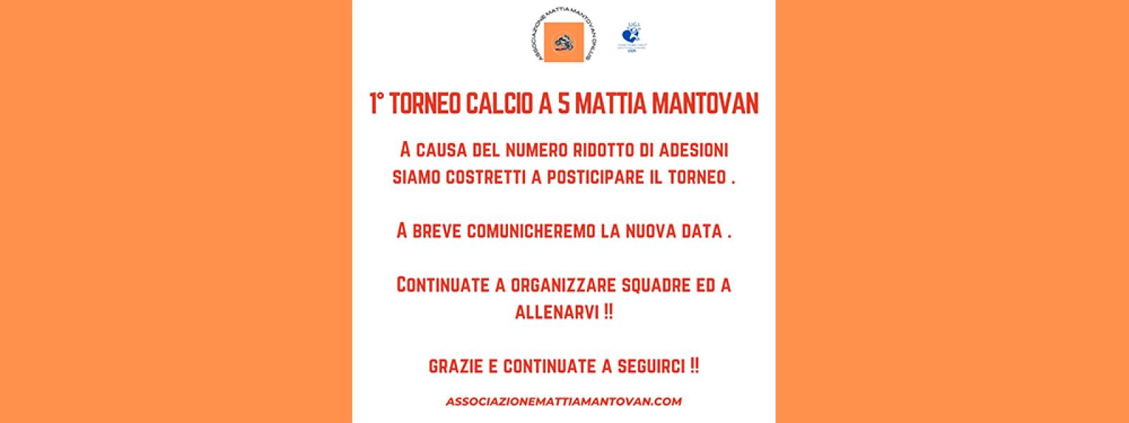 A causa del numero ridotto di adesioni siamo costretti a posticipare il torneo. A breve cominicheremo la nuova data Continuate a organizzare squadre e ad allenarvi! Grazie e continuate a seguirci https://www.associazionemattiamantovan.com/ Categoria: ultime notizie